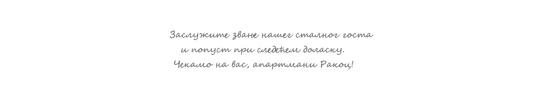 Najveći dokaz naše dobre usluge i kvalitetnih apartmana su veliki broj gostiju koji nam se redovno, iz godine u godinu vraća. Kako bi smo izrazili veliku zahvalnost na ukazanom poverenju prema Rakoc apartmanima, trudimo se da pored uvek dobre usluge, svojim vernim gostima ponudimo i interesantne popuste.